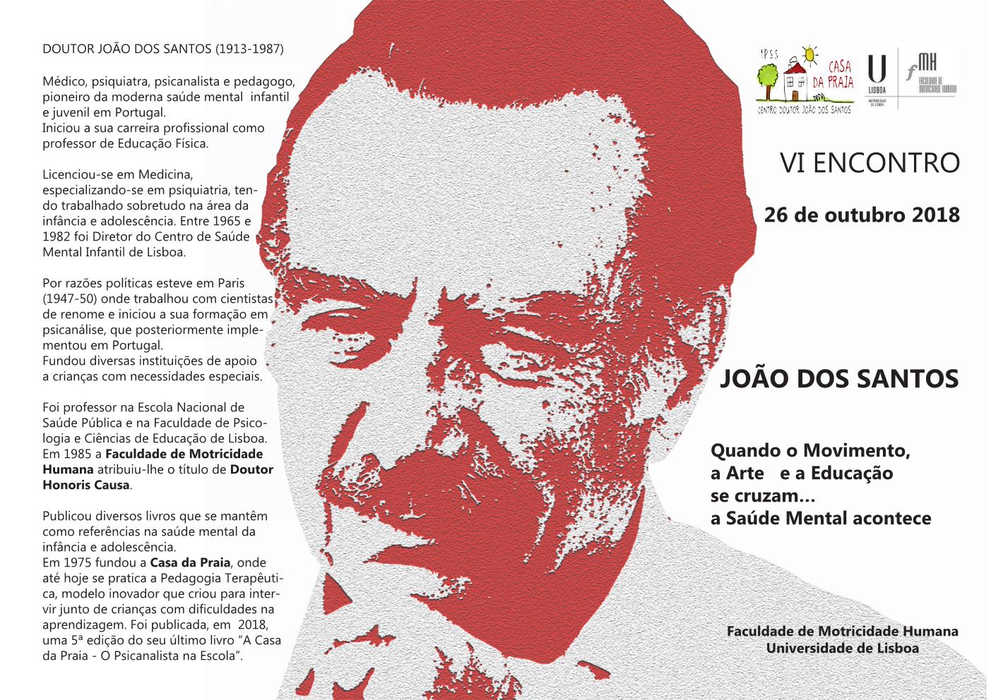 Gostaríamos de poder contar com a sua presença no dia 29 de Abril de 2022, entre as 9:30 e as 12:30, no Salão Nobre da Faculdade de Motricidade Humana, Universidade de Lisboa, para a sessão de encerramento do Projecto co-financiado pela Direção Geral de Saúde, intitulado “ Uma Casa da Praia em cada Escola – Educação e Saúde Mental: A pedagogia Terapêutica como suporte para a Inclusão”. A sua inscrição, indispensável, ficará validada após o preenchimento deste formulário.